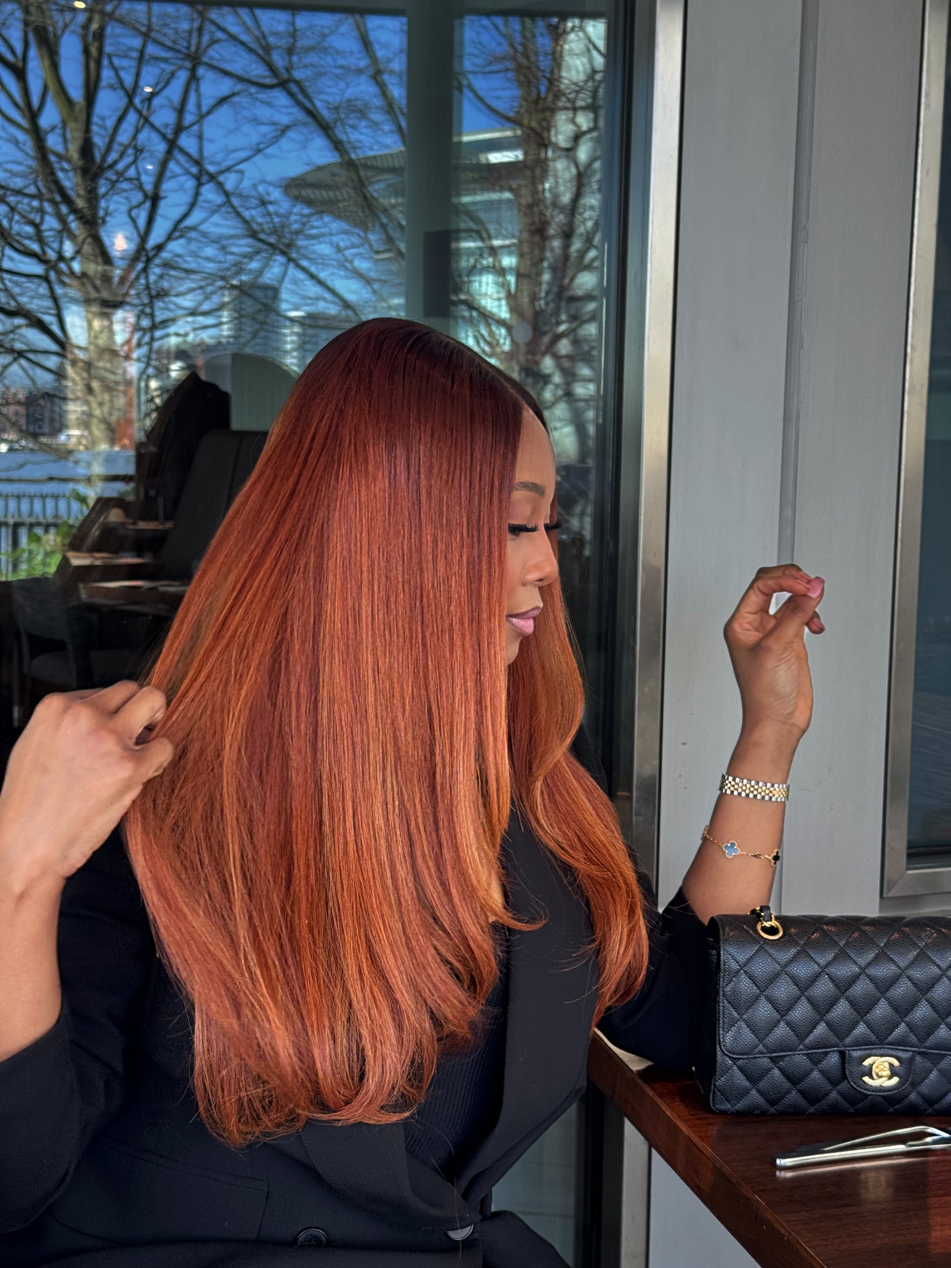 - Hair Colour: Highlighted copper blonde with copper brown roots
